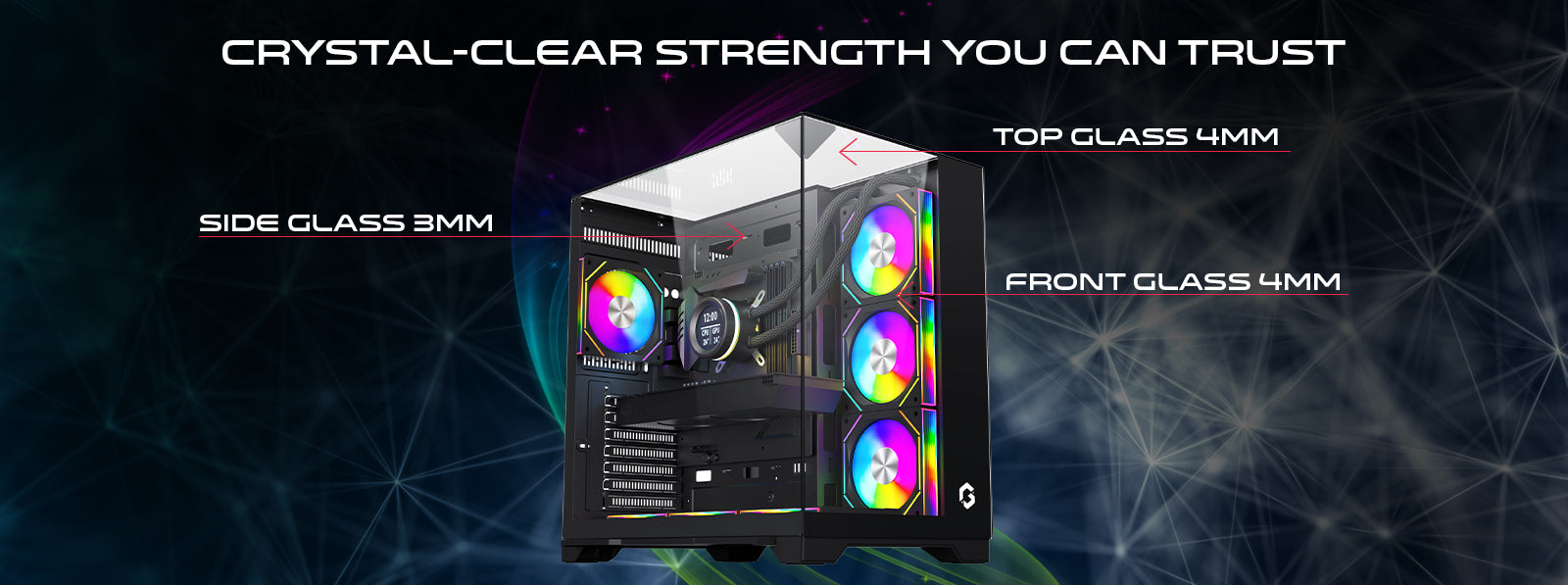 استمتع بالمتانة دون المساس بالأناقة. توفر ألواحنا الزجاجية الأمامية بسمك 4 مم، والعلوية بسمك 4 مم، والجانبية بسمك 3 مم حمايةً مُعززةً، ورؤيةً واضحةً، ومظهرًا أنيقًا فاخرًا - مُصممة لتحمل الاستخدام اليومي مع الحفاظ على رقيّها العصري.